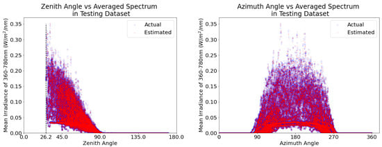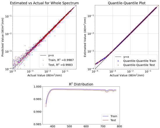The upper left panel of Figure 7 shows the scatter diagram showing the performance of this model by comparing the estimated value (y-axis) and the actual value (x-axis) of the irradiance, from 360 nm to 780 nm, observed by the reference sensor. The coefficient of determination () is 0.9987 on the training data and is 0.9983 on the testing data.