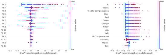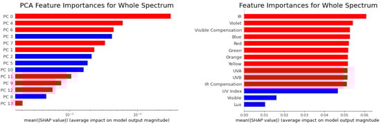 We are able to linearly transform the 0th principle component’s SHAP values to the original features with the first order contribution ratio , where  is the i-th original feature,  is the mean value of  and  is the coefficient of PCA transformation, as shown in the right panel of Figure 8. The original features, namely the red, orange, green, yellow, blue, UVA, UVB and IR (infrared) positively impact the model’s output, while some other features such as the UV index, Visible and Lux features negatively impact the model’s output. Please notice that we only simply use this linear approximation to visualize the main part (from 0th principle component) of the contributions of the original features. However, we should not sum up these original features’ SHAP values by combining all the principle components because the original features have strong multi-collinearity.