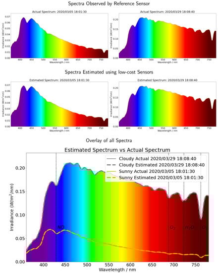 In the bottom panel of Figure 10, we overlay the actual solar spectrum and estimated solar spectrum for both sunny (5 March 2020) and cloudy (29 March 2020) cases. Furthermore, the figure displays the atmospheric absorption spectrum, including nitric oxide () at 429 nm, oxygen () at 688 nm and 762 nm and water vapor () from 720 nm to 730 nm []. Using data from the low-cost sensors, our machine learning model correctly obtained all of these absorption bands and showed the potential for detecting changes of atmospheric components.