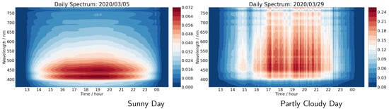 A comparison of the wavelength (y-axis) and UTC time (x-axis) resolved daily spectra for a sunny day on the left and for a cloudy day on the right. The color denotes the solar irradiance in unit W/m/nm. Both spectra were collected using the Minolta CL-500A Illuminance Spectrophotometer.