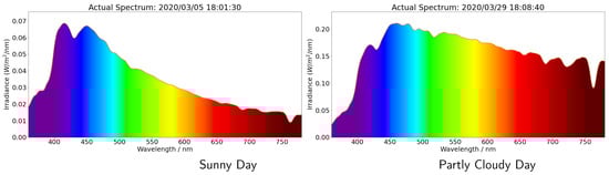 We can clearly observe the role of the variable weather conditions, such as changing cloudiness. When the direct normal irradiation (DNI) is stopped by the surrounding buildings, the photons reflected by the clouds increase the total intensity of irradiance. Furthermore, as the light scattering is wavelength dependent, the shape of the spectrum changes on a cloudy day. It was sunny on 5 March 2020. Note the higher spectral irradiance at the shorter wavelengths, indicating a blue sky day. By comparison, it was cloudy on 29 March 2020. Note how the spectral irradiances from the blue to red portion of the spectrum are much more similar than on March 5; the sky was closer to white than blue. Our ANN performed well for both clear sky and cloudy conditions, and the data from the low-cost sensors could be used to effectively reproduce the full spectra.