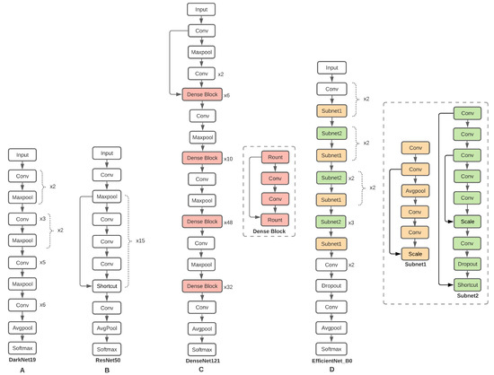 CNN networks used in this study. DarkNet-19 (A), ResNet-50 (B), DenseNet-121 (C), and EfficientNet-B0 (D).