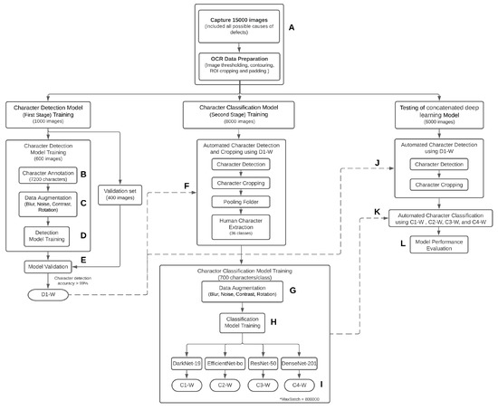 The second group of datasets obtained from 8000 preprocessed defect images was used to develop a character classification model. The character detection model described in Section 3.2 was employed with the loaded optimized D1-weighted parameter. A dataset of 96,000 characters was obtained by performing a cropping operation on the detected character image region (Figure 7B). After that, the cropped character images were manually labeled (Figure 7C) and sorted into 36 classes (0–9 number classes and A–Z alphabet classes). Each class had a total of 700 characters. The dataset was endorsed by two highly experienced observers (label F in Figure 4). There were a total of 25,200 characters used for training of the classification model in the next stage. Following this, data augmentation was carried out by taking into account several possible variants from the original images (label G in Figure 4). To achieve a 630,000-character dataset (17,500 per class), we altered the Gaussian blur filters by varying the values of standard deviation of 3, 6, 9, 12, and 15, adjusting the contrast by multiplying all pixel values with 1.0, 1.3, 1.6, 1.9, and 2.1.