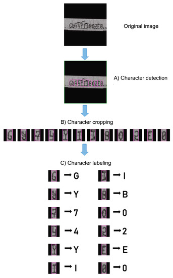 During image capture procedures in a typical industrial environment, there are two possible variants that are uncontrollable in the experiment setting (Figure 6A). First, variations in the positioning of the serial number on the captured images are caused by differences in the camera settings and installation of each unit. Second, differences in illumination in various settings culminated in variations in contrast in the captured images. To eliminate such variants, the standard image processing method based on opencv-python 4.4.0.44 [22] was used to extract only the serial number regions and contrast equalization. The Otsu approach [23] was used for image thresholding to generate a binary image (Figure 6B). The contour approximation technique was used to describe the boundaries of the area of interest (ROI), i.e., the serial number background. To keep all images the same size, ROI cropping was used, followed by additional padding on the background. Finally, as seen in Figure 6C, serial number regions were placed in the image’s middle, and the images were sized so that they all had the same height (608 pixels) and width (608 pixels).