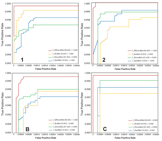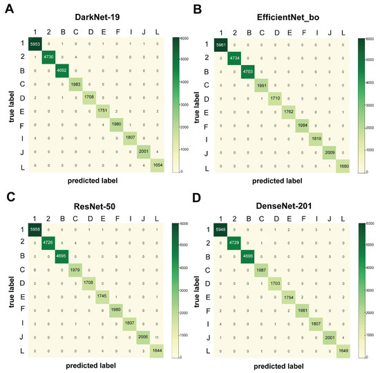 Receiver Operating Characteristic (ROC) assessments were also conducted to evaluate the proposed method’s accuracy in the top four groups (i.e., 1, 2, B, and C), which are the characters considered to have the greatest detection errors in the manufacturing process (Figure 8). According to Figure 8, the region under curve (AUC) values for all CNN models is greater than 0.99 in all four classes. As opposed to other CNN versions, EfficientNet-B0 has the highest AUC values (ranging from 0.999 to 1.000) in all four groups (see red lines in Figure 8). Identification errors from 36 classes were counted and sorted to assess the models’ classification performance. To generate confusion matrices, the top 10 groups (i.e., 1, 2, B, C, D, E, F, I, J, and L) with the largest recognition failures were chosen. Figure 9 illustrates the confusion matrices for each model. The color scales reflect the number of projected characters in each class that were compared in four CNN models. The EfficientNet-B0 model was found to have the best classification efficiency. We discovered the following general shortcomings in recognition: ResNet-50 (11 missing), DenseNet-121 (4 missing), and DarkNet-19 (4 missing), with the character “J” misspelled as “L” many times, while EfficientNet-B0 had none. Although the EfficientNet-B0 model produced the best performance, it still takes the most training time (more than 133 h) and is approximately 2.66 times more expensive than the DarkNet-19 model (more than 49 h) (Table 1).
