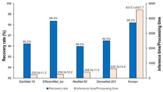 It is important to have at least 99% Accuracy, Precision, Recall, and F1 score for implementation in real-time classification on a production line. To assess the feasibility of the proposed method, the effective inference time of the proposed method should be <300 milliseconds (ms), which is the inference time of the OCR-based computer vision. Inference time (per image) was compared in four different CNN networks, i.e., DarkNet-19, EfficientNet-B0, ResNet-50, and DenseNet-201.