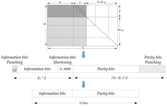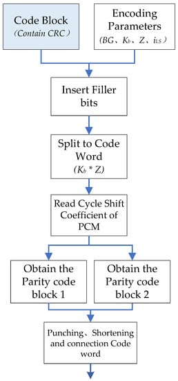 In a TTI, a transmission channel delivers up to two transport blocks to the physical layer, A bits TB attaches either 24 bits CRC or 16 bits CRC according to TB length, and TB can be further partitioned to code word (CW). It needs to be divided into C code block of B bits, each code block will attach 24 bits CB-CRC, and finally it becomes the transport block size (TBS) of K bits. is the maximum length of the code block with CRC, is 8448 for BG1, and 3840 for BG2. The base graph and TB length also specifies the number of columns in the kernel matrix of the parity check matrix H. So , where Z is lifting size and is also the length of each CW. Each C code block after segmentation consists of CW. After LDPC encoding is completed, a code length of N bits is outputted. The encoding output result N bits is composed of n Z-length CW. The encoding of each C code block is independent. After the respective LDPC encoding, rate matching and interleaving are performed respectively. The 5G QC-LDPC encoding process is shown in Figure 2.