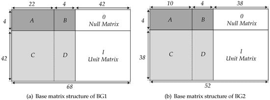In 5G NR, the channel coding scheme also adopts QC-LDPC codes. For the compatibility of multiple scenarios, the 5G standard has developed two different base graphs, BG1 and BG2, which correspond to two different base matrices, and . According to the lifting sizes of 5G QC-LDPC codes, the matrix corresponds to a total of 16 parity check matrices (PCM) which defines the 5G LDPC coding schemes []. Therefore, the hardware that supports 5G NR codes must provide a high level of flexibility to satisfy different PCMs.