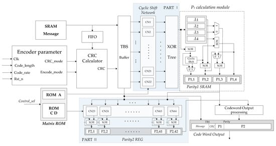 According to the aforementioned high parallel encoding algorithm, the encoding calculation is actually to complete the multiplication of the PCM and the information vector. PCM is composed of zero matrix and unit cyclic shift matrix; the multiplication of these submatrices and the information vector is actually a bit-level cyclic shift. Thus, the encoder designed in this paper is implemented by cyclic shift network and combinational logic circuits. The encoding calculation is mainly composed of two parts in parallel, Part I calculates in Equation (5), and Part II calculates and in Equation (6). In order to realize low latency encoding, 64 cyclic shift network (CN) modules are used, which are barrel shift logic. The encoder mainly consists of the following functional modules: