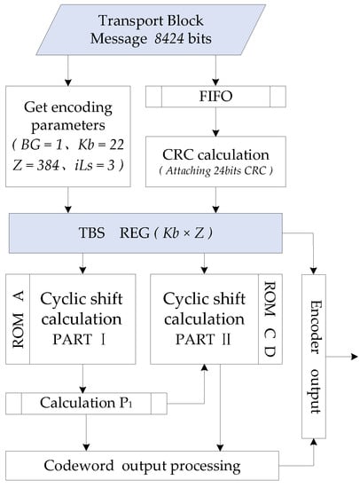 5G NR has three scenarios, enhance Moblie BroadBoand (eMBB), Ultra Reliable Low Latency Communication (URLLC), and massive Machnice Type Communication (mMTC). Specifically, it requires a peak throughput of 10 Gbps for the uplink, 20 Gbps for the downlink, and a user-plane delay of 4 ms for eMBB and 1 ms for URLLC. After evaluation by 3GPP, it is confirmed that the LDPC encoding scheme under BG2 designed for eMBB scenarios is used in URLLC scenarios (mainly low latency) []. In [], a prototype of 5G physical downlink shared channel (PDSCH) transmitter was carried out on software defined radio (SDR), with channel coding experiments including complete processing flow of data transmission in TS38.212, and the system performance of 5G NR was evaluated. In some studies, 5G LDPC encoder is designed according to the complete encoding chain of uplink and downlink channels [,], including cyclic redundancy check (CRC) encoding, code block segmentation, LDPC encoding, rate matching, and bit interleaving. By assembling all the processes in the encoding chain, fully functional encoding hardware products can be delivered. At the base station transmitter, channel coding is the crucial operation that affects the bit processing time in physical layer. Therefore, it is necessary to propose a higher parallel encoding algorithm and hardware architecture for 5G QC-LDPC.