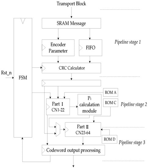After the parameters are calculated and information bits are stored in SRAM, finite state machine (FSM) issues CRC calculate enable signal. When CRC calculation is completed, the encoder is enabled, the parity check matrix is read in, and the information encoding is carried out. After completing the Part I operation, the calculation of starts. After obtaining the first set of parity codes, the hardware waits for the completion of the first round running of Part II, and the input information is switched to to calculate the second set of parity codes. When all parity codes are obtained, the encoding end signal is enabled to reset the FSM. The encoder returns to the initial state to perform the encoding of the next frame of information data.