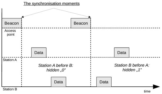 Transmitting covert information by using the relative order of frames embeds information in the timing relation of frames being sent by multiple participating terminals. Its operation requires at least two wireless network terminals that send data frames of regular, non-covert information. The covert information bits are encoded in two cases: Station A transmits the frame before station B (e.g., bit 0), and station B transmits the frame before station A (e.g., bit 1). Covert information is conveyed by order of the frames transmitted from the stations to the access point (with the ToDS field set to one). Frames that are retransmitted by the access point (with the FromDS field set to one) are not considered. It is also necessary to designate the moment at which the relative frames order check begins (the synchronisation moment). Such time may be, for example, the end of a beacon frame transmitted by the access point. An example of covert bit transmission is shown in Figure 2. It does not show frames retransmitted by the access point as they are not relevant in the proposed method.