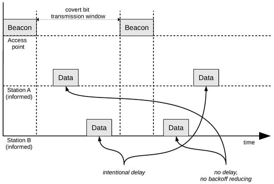 Timing methods are more complicated than the methods presented above. In general, they exploit different parameters of timing relations during data transmission. The typical timing method has been described in []. Covert data are transmitted by selecting an appropriate value of the backoff time that is usually used to enable collision avoidance in medium access protocols. The backoff time is randomised for every frame in the Wi-Fi network. Thus, by deliberately increasing or reducing the backoff time (the delay in frame transmission start), it is possible to create a covert channel. An interesting description of these methods can be found in []. Typical timing solutions for IEEE 802.11 networks that take advantage of their properties (e.g., non-deterministic media access) are also available. An example of such a method has been described in []. Another solution for the timing covert channel has been presented in []. This covert channel was implemented by scanning TCP ports in a specific order.