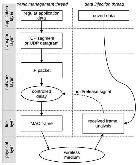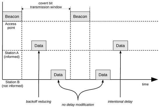 Wireless networks are extensively used nowadays in personal, commercial, or small office applications and professional or critical infrastructure such as security cameras and sensors, industrial automation, autonomous drone management, etc. For this reason, the wireless network security is a concern of the scientific and industrial community but mainly focuses on the security of the used protocols, cryptographic strength, and implementation flaws. Cryptography is not the only method to secure data transmission in wireless networks. A different approach is to use steganography—a technique that enables the data transmission in a hidden manner. A definition of steganography was provided in [,], but in this paper we restrict it to network steganography []—steganographic methods exploiting computer networks. The critical factor for steganography is to make the data ’covert’ so that no one would be able to receive the information. This is the fundamental difference between cryptography and steganography. Using cryptography, the data can be received by virtually anyone but cannot be decrypted by anyone except the authorised recipient. Steganography may be treated as complementary to cryptography and is an alternative approach that is (by its definition) rarely reported to be used as its security is related to algorithm secrecy.