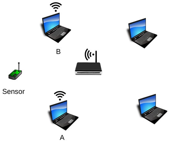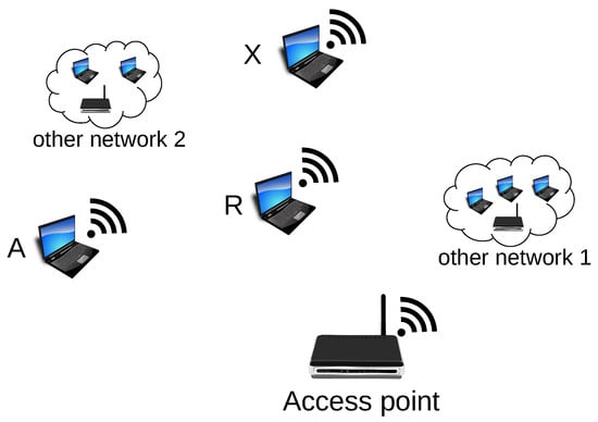 The first experiment was performed on the 2.4 GHz band with IEEE 802.11n devices. Since that band is widely used, the random operation of other network nodes and access points on the same radio channel was present during the experiment. The conditions were far from ideal as five independent stations and two access points were operating on the same radio channel. Such environment simulates the Wi-Fi wireless network’s actual, real-life conditions well. This experiment assumed that two stations transmit covert information simultaneously. The Both-informed stations were A and B (Figure 8). The third (R) microcomputer was introduced as a passive receiver of the covert messages (the sensor).