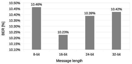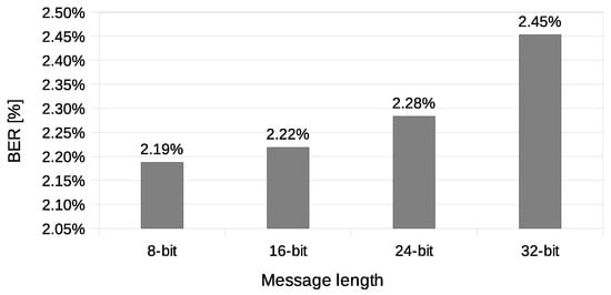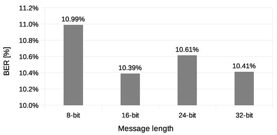 The calculated BER values (Figure 10) were between 2.19% and 2.45%. These values are far from ideal, but it is important to note that the experiment was performed in an empirical scenario, with other wireless networks operating on the same radio channel interfering with its operation. It is still possible to send messages reliably with such relatively high BER value by using adequate redundancy (error correction codes such as BCH or Reed–Solomon’s code) [,] or message repetition in exchange for usable bandwidth. The goal of the experiments is to present the parameters of the proposed covert channel, and the experiments related to hidden data preparation (such as adding error correction codes) exceed the scope of the paper.