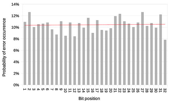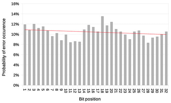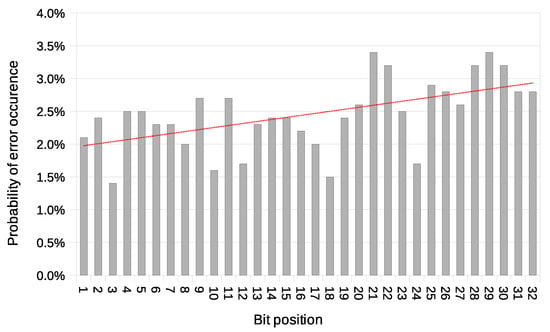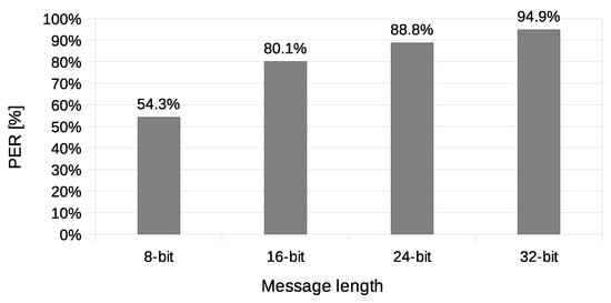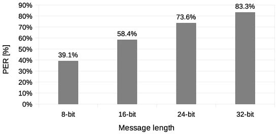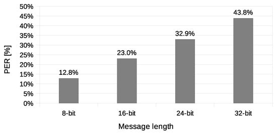 Another used transmission quality metric is the packet error rate (PER) defined in Equation (4). The results of the packet error rate obtained in the experiment are shown in Figure 11. The 12.8% of 8-bit long messages and 43.8% 32-bit long messages were broken—with at least one bit altered (Figure 12). The shortest covert messages had the highest probability of being received as correct because of the lowest probability of desynchronisation resulting from Beacon frame ommision in one of the stations. If one of the stations does not receive the Beacon frame during the transmission window, it will desynchronise with the other station and send n-th bit when the other station sends the bit. If this happens, the received message will be broken from this erroneous bit until the end of the message. Due to this problem, it is more reliable to form and send shorter messages. The probability of error occurrence as a function of bit position is shown in Figure 13. One can observe the dependence between bit position and the probability of error occurrence. That phenomenon is most probably connected to non-ideal beacon time tracking that causes slow desynchronisation of the stations.
