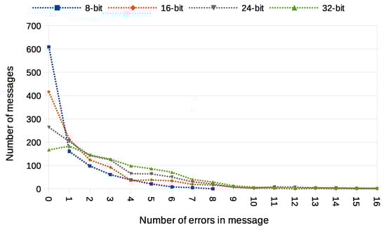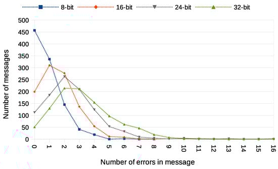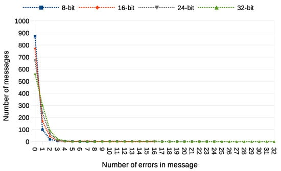 In order to fully understand these PER values, we also need to examine how many errors have been received in particular messages. This is shown in Figure 12. It is noticeable that most of the messages were received without errors or with a minimal number of errors. The number of the longest 32-bit messages received with at most one error bit is 864, which is an outstanding result compared to most steganographic methods of data transmission.