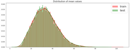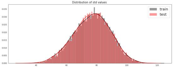 From Figure 2, we can observe that the values of training and testing sets are quite identical, which indicates that the means of the features in training and testing data are very close. In this figure, most of the values cluster around the central peak, which means that the values in training and testing sets are normally distributed.