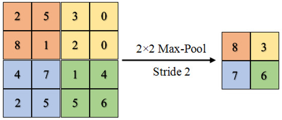 As shown in Figure 7, we extract the patches from input feature maps, take the maximum value of each patch as output, and disregard the rest of the values. Unlike height and width of the feature maps, we leave the depth dimension without changing it (as illustrated in Figure 6) [30]. In other words, when the size of the input is , the size of the output will be , where: