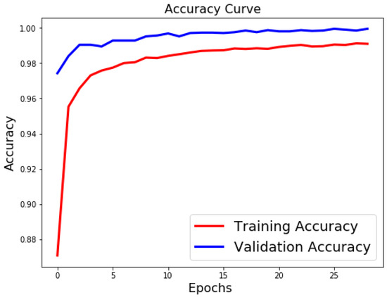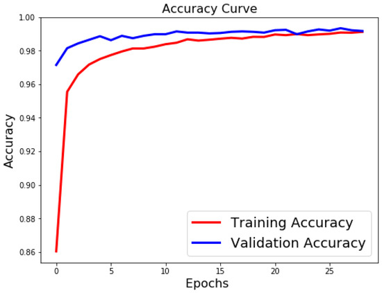 Table 10 lists the results of training loss, validation loss, training accuracy, validation accuracy, and running time. The results listed in this table have been achieved by the proposed convolutional neural network after adding 50% noise. In this table, the highest accuracy achieved for the noisy handwritten digit recognition is 99.40%.