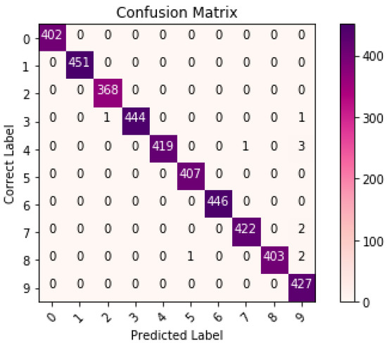 As we can see in Figure 13, in some cases there is an amount of almost of the values that have exist outside the main diagonal, which means that our proposed algorithm still produces some of the mislabeled elements. The principal reason for the failure of our model to correctly labeled these elements could be that the different handwritten digit images vary in size and style, which makes the classification mission much harder even for humans. In addition to that, our CNN model with data augmentation consumes a bit more time than CNN without data augmentation because of the extra data that has been extracted from the original dataset.