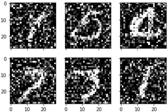 Figure 16 shows some of the MNIST handwritten digit images obtained by adding additive white Gaussian noise (). From Figure 16, we can see that the images have been seriously damaged by a massive amount of additive white Gaussian noise, which makes the classification mission of these images extremely hard even for the human eye. Nevertheless, our proposed algorithm has achieved great classification results with a recognition accuracy of 99.40%.