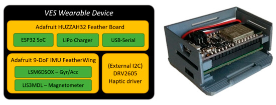 - Inertial device: an embedded system with a 6-Axis IMU which provides rotation data. This role is played by VES-W devices, which include a LSM6DSL 6-Axis IMU and an ESP32 SoC. The fusing of accelerometer and gyroscope data, as well as the correspondence between IMU’s and body part’s orientation is carried out in the same device.