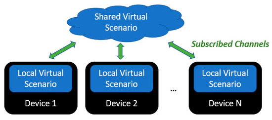 Once a device creates an element in a specific channel, it is registered as host in a local replica of the virtual scenario (Figure 3). Thereafter, all subscribed devices creates or updates the element in their local virtual scenario as a remote element. For instance, position, orientation, or even dimensions of a physical element, e.g., a wall, can be set as properties subject to be updated throughout the network. The updates have a timestamp associated, which allows for applying at the same time in all subscribed devices. Also, it is a key feature to emulate random package delay in the communication.