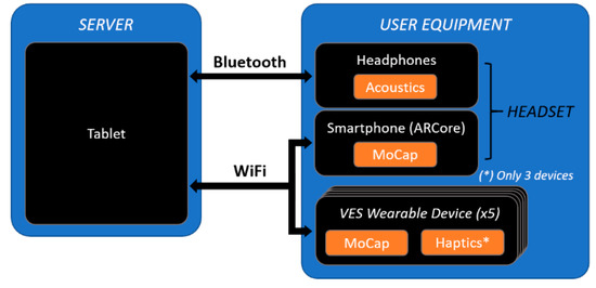 - User equipment: A Xiaomi Mi 9T Pro smartphone, five “VES Wearable Devices” (VES-W) and Bluetooth headphones. The smartphone runs a Unity-based software application which captures head movements through visual inertial odometry (ARCore) and adds it to the shared virtual scenario as a 3D object. Analogously, the VES Wearable (VES-W) devices capture and share torso, arms, and forearms motion data.