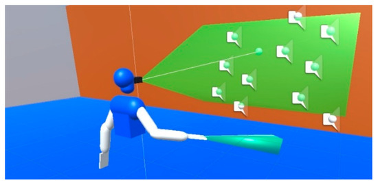 - Projected Virtual Acoustic Space (PVAS) [16]. It is visual-acoustic sensory substitution algorithm based on Virtual Acoustic Space [24]. The algorithm simulates a depth sensor carried by the user and generates virtual sound sources over the surfaces in range of the sensor’s field of view, as shown in Figure 6. The sensor’s range was set to 20 m, with a field of view of 50 × 30 degrees. As for the output, it reproduces a sequence of short audio pulses (typically 20–50 ms) which differs according to the object’s material.