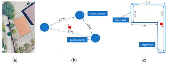 Testing field (a). Virtual environment of the first (b) and second (c) tests. The starting position and orientation are represented by a red dot and arrow.