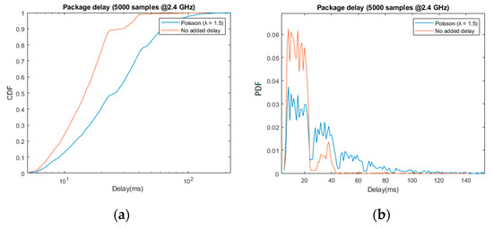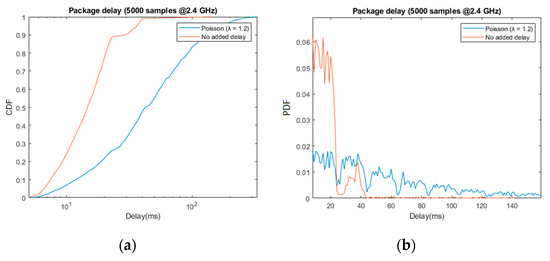 Capture of the update data’s delay before (orange) and after (blue) adding jitter, λ = 1.5. The graphs show the cummulative distribution function (a) and probability distribution function (b) of the sample (5000 packages sent).