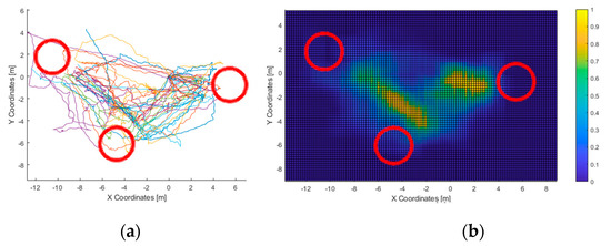 Test 2—Path heatmaps of those who passed the test (a) and those who did not (b). Spatial resolution: 5 cm. Low-pass FIR: 25 × 25 cell flat impulse response.