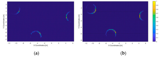 Test 1—Haptic (a) and acoustic (b) heatmaps. Spatial resolution: 20 cm.