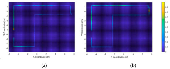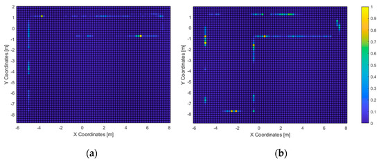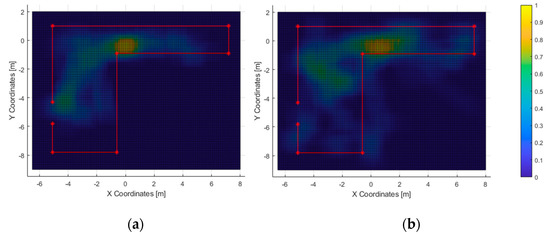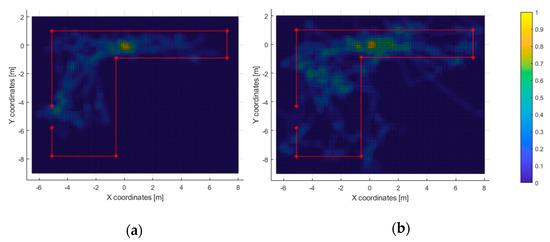 Test 2—Path heatmaps of those who passed the test (a) and those who did not (b). Spatial resolution: 5 cm. Low-pass FIR: 9 × 9 cell flat impulse response.
