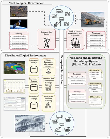 In recent years, Digital Twin technologies have attracted considerable interest among researchers [7,11,13,14,26]. Although the conceptual idea of a Digital Twin (Digital Shadow)—that is, a model that completely copies the behavior of an object and, in a certain sense, even predetermines its future state—has been known for more than 15 years [27,28], opportunities of using such a system in control tasks (such as strategically and operatively for dispatching) open up today [29,30]. Further, if for discrete conveyor-line production at the moment there are mainly technical issues of implementing control using 3D models built using digital twin technologies; then, for productions with continuous and nonstationary technological cycles and with a huge fleet of different types of sensor devices, (in particular, transport and technological operations of open-pit mines apply to that type of processes), there are problems associated with the integration, and temporal and spatial scaling of heterogeneous information flows for the creation of digital twins [31,32,33,34,35,36,37].