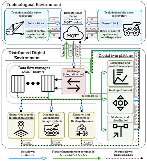 - Brokers of messages of the technological environment, which are necessary for organizing the transfer of data between agents of the same or different classes within the technological environment and their switching with the service bus of the enterprise. These smart devices should be located on stationary repeaters in the quarry, and their main purpose is to aggregate telemetry information from agents of uniform technological or geographic groups, transmit control commands from the enterprise service bus to agents, and transfer telemetry data and command execution results back to the service bus. The second task of these brokers is to organize information interaction between agents within the groups in the implementation of complex automatic operations, which involves maneuvering a dump truck when approaching an excavator loading or maneuvering when passing while on a transport site. For example, MQTT brokers provide fast and reliable transmission of measured telemetry to minimize errors in the determination of mutual approach distances, which was confirmed using laboratory physical modeling.