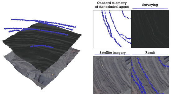 Each of the listed sources forms an isolated data layer describing the geospatial position of the technological zones of the quarry and provides information similar in its properties, but different in the physical nature of the measurement. The general layer-by-layer representation of geospatial data, obtained as a result of processing various information flows, is shown in Figure 4.