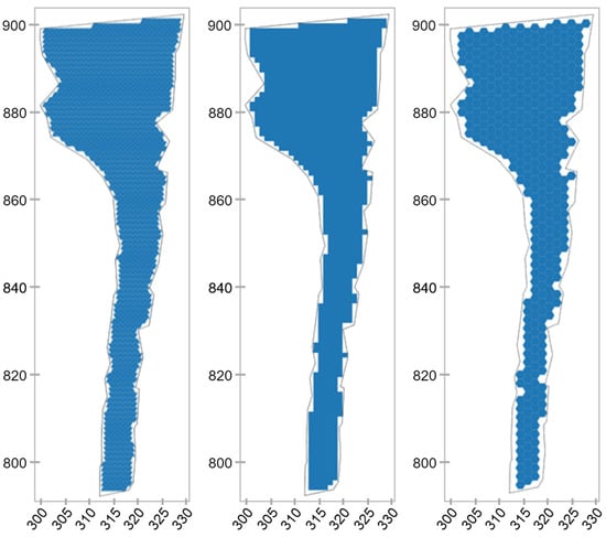 As noted earlier, the procedure for filling a technological zone with the correct polygons is an important stage in the construction of a digital model, since it defines the spatial characteristics of atomic elements. However, this task is quite trivial and is of no independent interest. Figure 7 shows several options for tessellation, paving a real fragment of the roadway using atomic elements of three types (triangle, square, hexagon). An important parameter that must be taken into account when using the model to solve practical problems is the area of this technological zone (equal to 1244 m2). When calculating the areas of figures of complex shape, the boundary points of which were determined in a different way, the well-known Gauss formula was used: