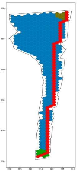Table 3 also shows the characteristics of the algorithm when determining the trajectory of a mobile agent between some boundary points of the route while using models with different geometric parameters. From the results of the calculations, it can be seen that the computation time (correlated with the complexity of the computed trajectory) and the accuracy of the road surface approximation are critical parameters that determine the structure of the model. It can be seen that when choosing an atomic element that is too small, the calculations can take several hours. On the other hand, a tessellation paving accuracy of less than 80% significantly reduces the space for the efficient movement of an autonomous vehicle and its safe maneuver.