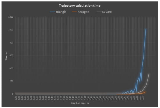 where is forecast trajectory calculation time for one technical agent; are types of atomic elements (triangle, square, hexagon); is length of the edge; is a parameter that characterizes the accuracy of “contouring”; is completeness of filling the technological zone with atomic elements; , are coefficients.