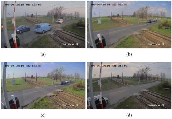 The study uses a representative set of images recorded at one of the maintained RLC sites. The original video material with a resolution of 1920 × 1080 (FHD) is cut into frames for training the CNN and testing its performance. A random selection algorithm is used to obtain frames from a number of days of observation of the RLC at different times of the day and during different weather conditions. Figure 1 presents a sample of frames recorded at different times of day.
