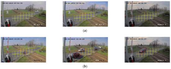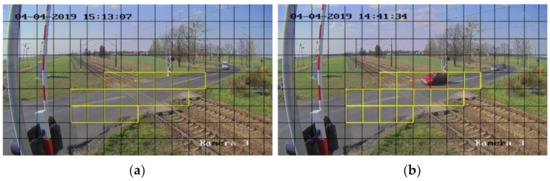 Figure 2 presents the RLC ROI marked in yellow (a) and an example with a car (b). The squares with the car have red edges. Two states of the ROI are defined: (1) safe passage for trains—the train can safely pass though, and all the squares are free of objects, (2) with objects–the safety of passage is endangered, and one or more squares contain objects or parts of objects.