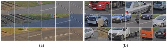 The proper parameters of the CNN are obtained in the process of training using frame sets as in Figure 5a. There are two sets defining the classification scope: one with objects or parts of objects and the second showing empty road and rail tracks. Video data comes from the site thatis the subject of classification. The square patches of the RLC ROI are used for training. A setup prepared for another site may be a useful start point for training and greatly reduces the training time.