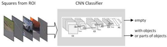 - design of CNN for the classification of the content of image patches of the RLC area and thus, the determination of its occupancy instead of detecting obstacles in the area,