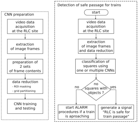 The proposed classification method consists of the following steps, as shown in Figure 5b. Video data is acquired from the cameras located at the RLC. The video stream is cut into frames. The contents of the frames is masked by the ROI mask covering the area important for a safe passage of the train. The ROI consists of a number of square patches. Video data from these squares constitutes the input of the CNN. In the case of using GPU for processing, the CNN can be duplicated. Multiple CNNs significantly accelerate the processing of video data.