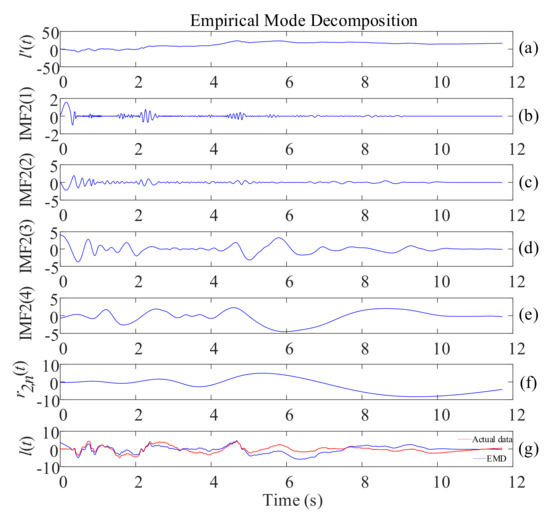 Figure 2. Example of EMD: (a) pseudo displacement; (b–e) different IMFs of the signal; (f) residual of the signal; (g) the displacement obtained from EMD and the actual displacement data.