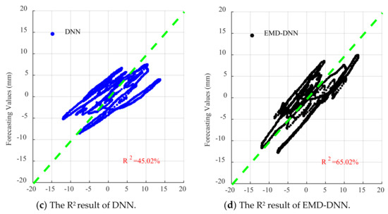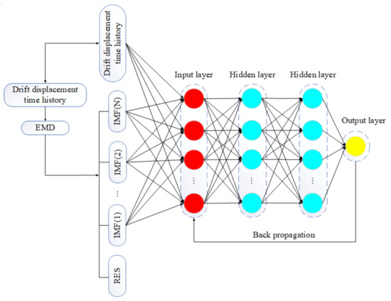 - DNN can extract the features of multi-time-series IMF obtained by EMD decomposition, taking displacement time-history curves of different IMF components and drifting as the sample set, these are inputted into the DNN model for training and prediction; finally, improving real displacement response prediction accuracy. It can be obtained from various evaluation indexes that EMD–DNN has the highest accuracy compared with other methods.