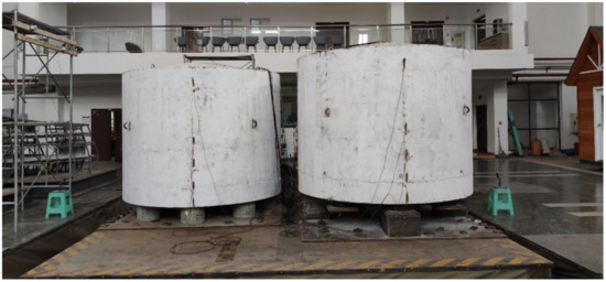 The test was carried out in the shaking table laboratory of Chongqing University (Figure 5). The length and width of the shaking table were both 6.1 m and the maximum bearing capacity was 60 tons. Taking the 160,000 LNG storage tank as the prototype, the length similarity coefficient = 1/30, Poisson’s ratio similarity coefficient and strain similarity coefficient were both set as 1, and the acceleration similarity constant = 1. The similarity relationship was obtained as follows: